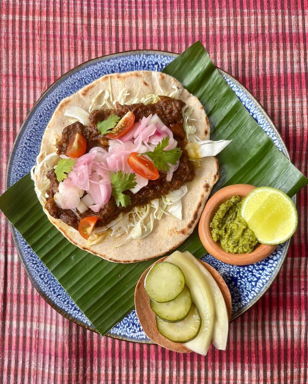 Tortilla bekatul beras, kambing muda 10-bulan, acar timun suri, salsa cabe gendot