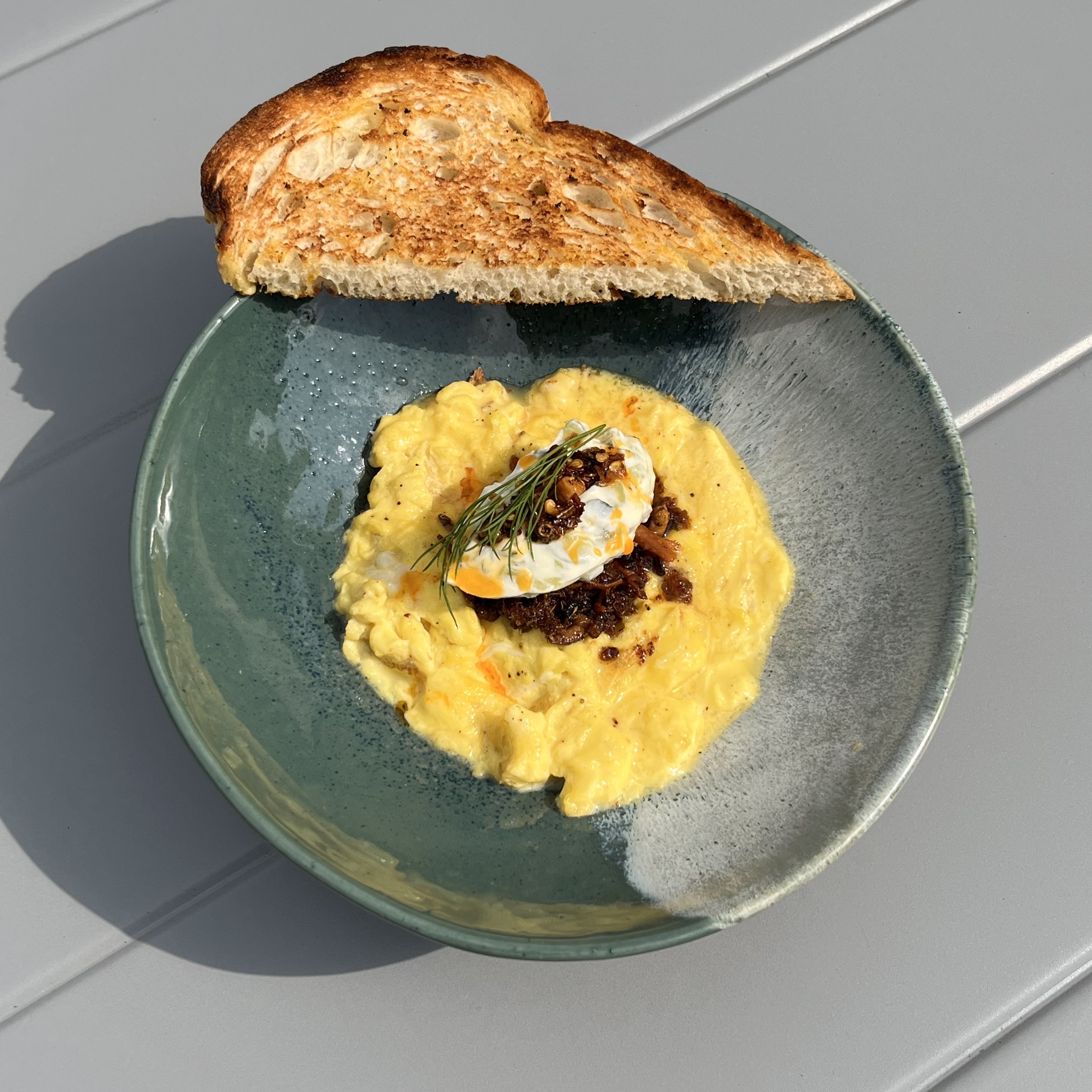Scambled egg, pickles sour cream, teri dan oncom, garlic oil, chilli oil, sourdough kampung toast