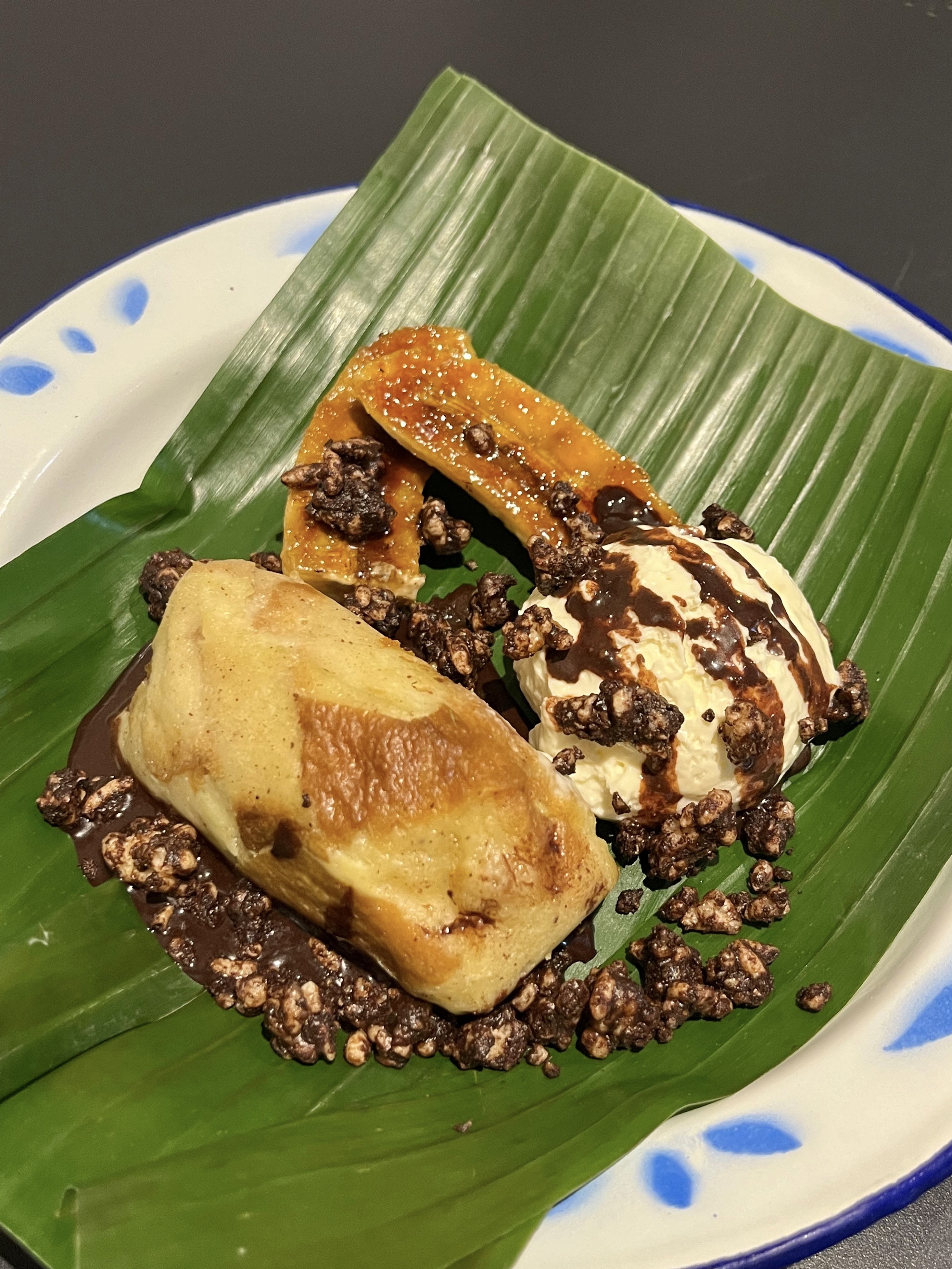 Botok roti sourdough, cream cheese ice cream, pisang ambon, rengginang cokelat